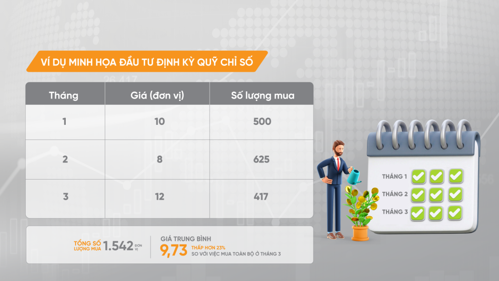 Giả sử bạn đầu tư 5 triệu đồng/tháng vào một quỹ chỉ số, minh họa đầu tư định kỳ thể hiện như sau: