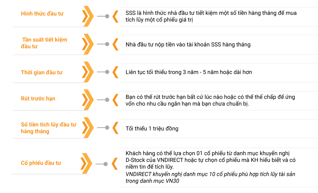 Thời gian đầu tư SSS được khuyến nghị là tối thiểu 3 năm. Hình thức đầu tư là khách hàng nộp tiền đều đặn hàng tháng vào tài khoản SSS và thực hiện mua số cổ phiếu tối đa có thể mua. Hàng tháng, VNDirect sẽ thông báo nhắc lịch nộp tiền và lịch mua cổ phiếu thông qua email cho khách hàng (vào đầu tháng và cuối mỗi tháng).